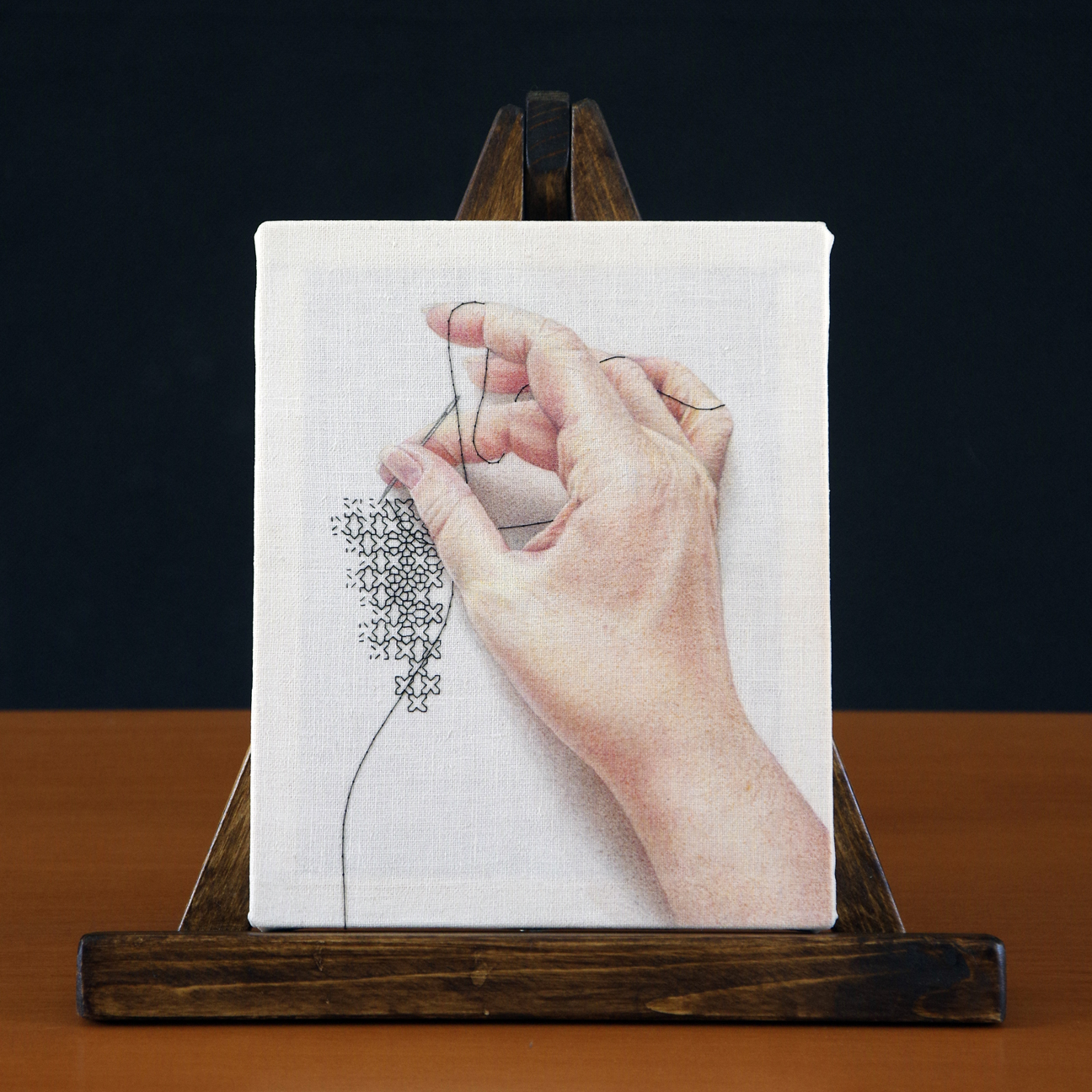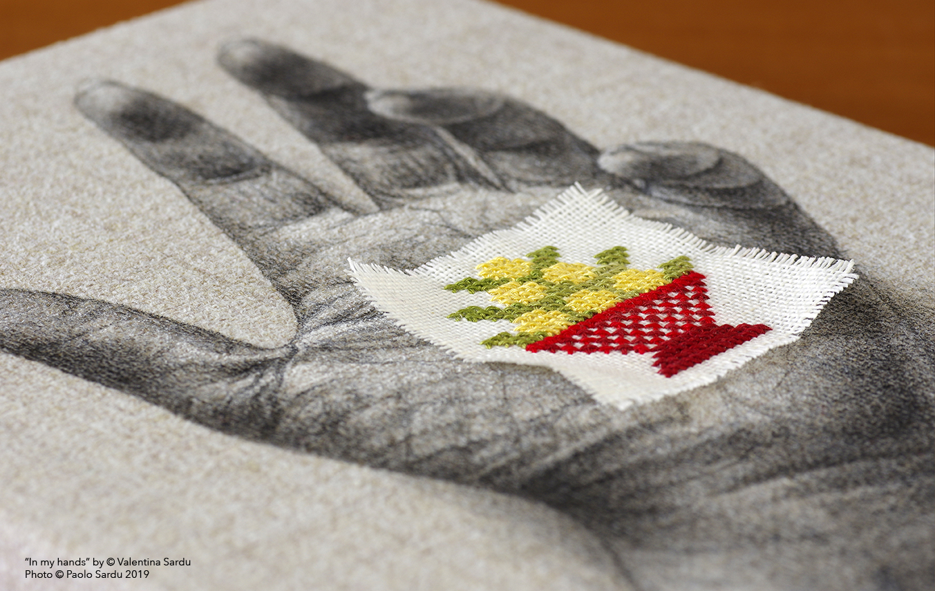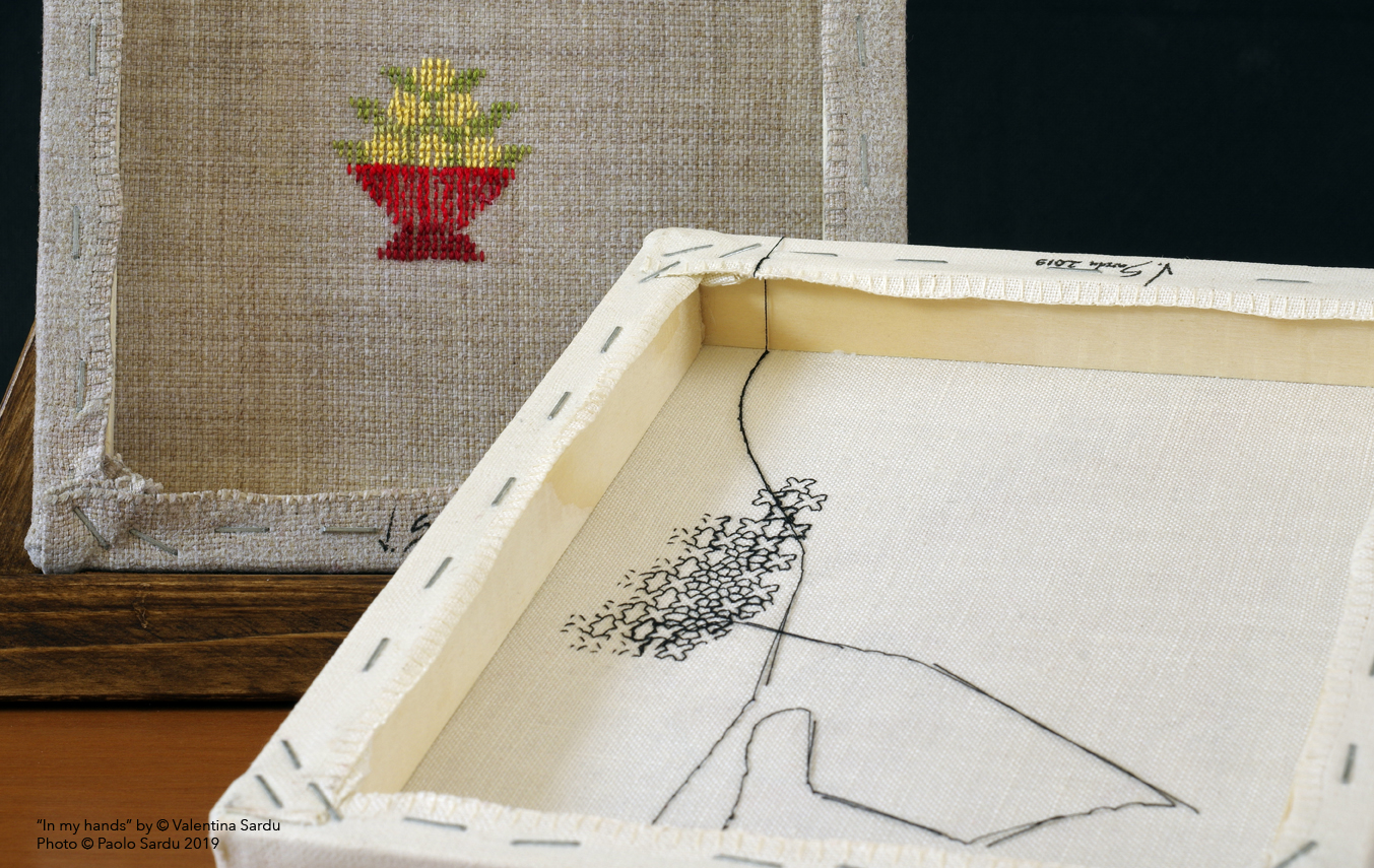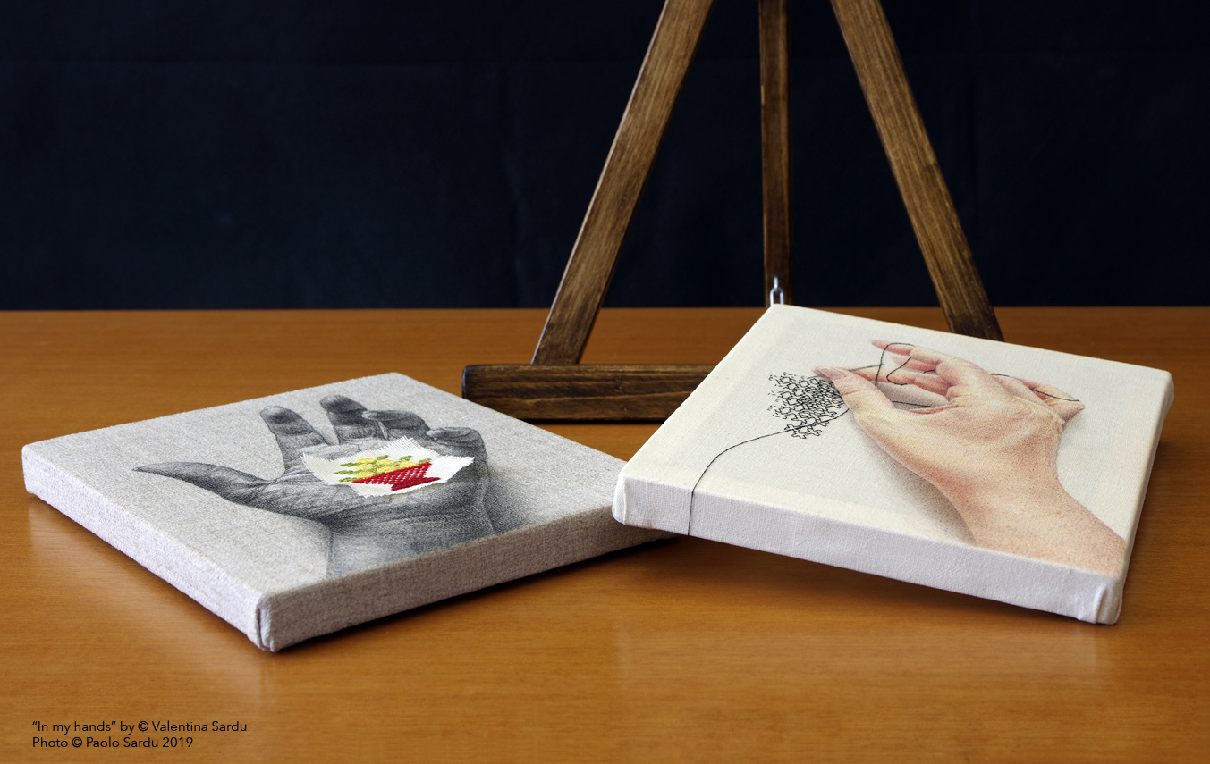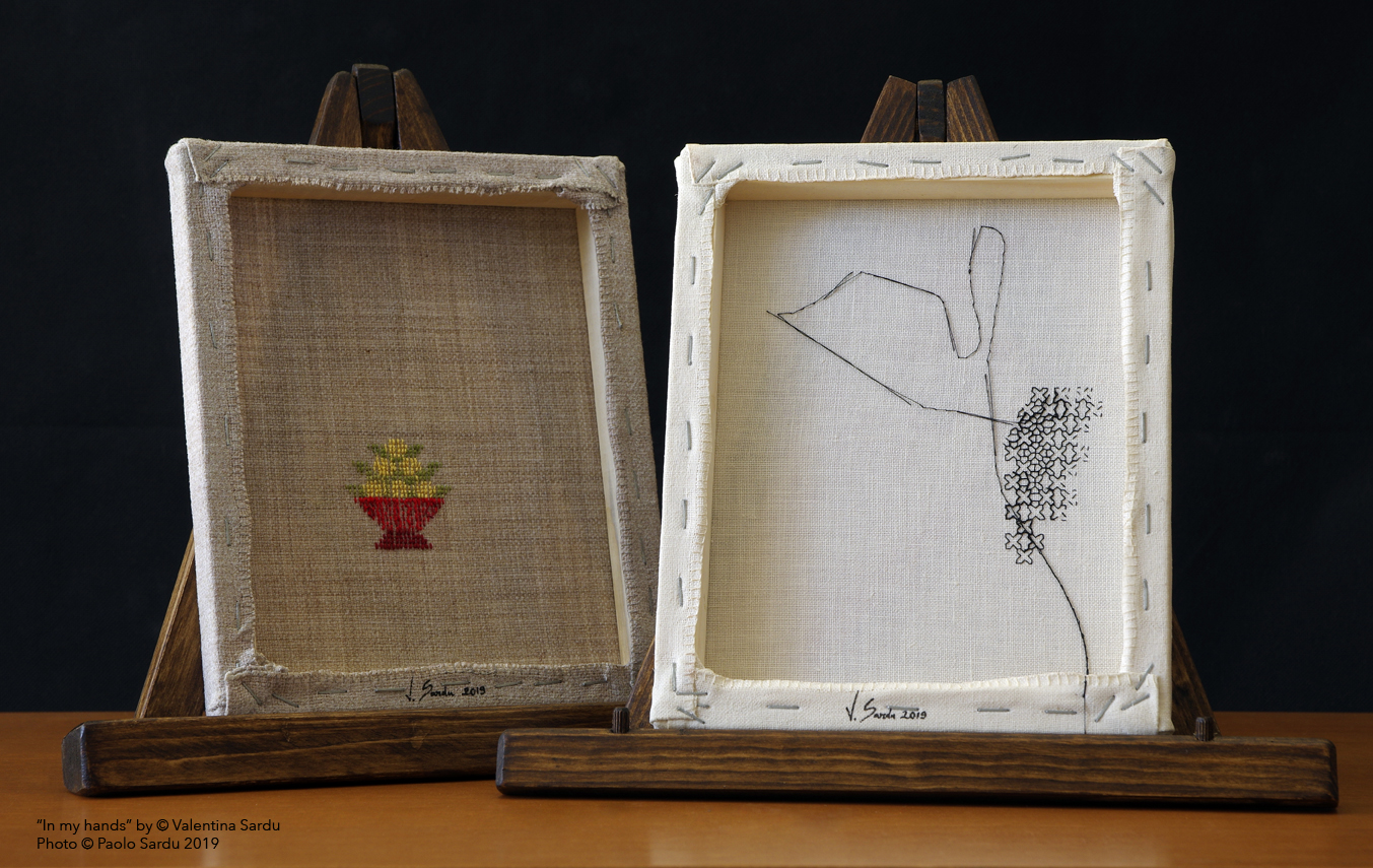 Disegni e ricami su tele a trama regolare. Matite colorate, pastelli secchi, grafite, unite a due tecniche di ricamo a fili contati, il punto croce e il blackwork. Ho voluto sperimentare e questo è il risultato: due tele, due opere separate ma legate nel significato. La mano sinistra, in grafite e pastelli secchi, sorregge un frammento di lino su cui è riprodotto fedelmente con fili antichi di cotone n°25 un motivo di un sampler del 1889, opera della mia nonna di quarto grado, Virginia. Si tratta di un cesto di frutta, simbolo benaugurale per la famiglia. È proprio il ricamo a tenere unito il pezzetto di lino alla tela disegnata, lo si vede chiaramente sul retro. Le trame del passato e del presente si fondono. L’una è parte dell’altra. La mano destra, realizzata con matite colorate, è intenta a ricamare. È il mio ricamo, il blackwork, fatto con il mio amato filo da cucito n°50. La posizione delle dita è volutamente “ingarbugliata”, così come il filo che scorre sulla tela percorrendola non solo sul davanti, ma anche sul retro, passando lungo la parte inferiore. Non c’è un inizio né una fine.Valentina Sardu