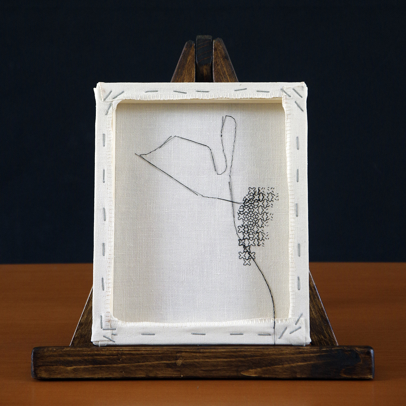 Grafite, pastelli secchi e ricamo in cotone su frammento di lino color crema a trama regolare 12 fili/cm (30 count), applicato ad una base di tela in misto lino color greggio. 21,5 x 17,5 cm.