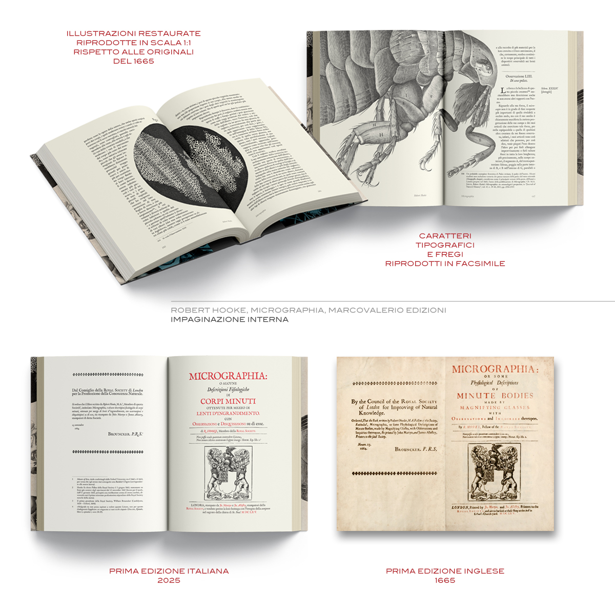 Il testo, corredato di note e arricchito da un apparato bibliografico ragionato, è proposto in una veste grafica aderente all’originale londinese del 1665, con caratteri e fregi tipografici riprodotti fedelmente e completo delle splendide illustrazioni, ora attentamente restaurate, che lo resero celebre all’epoca richiamando l’attenzione di tutta la comunità scientifica europea. Un’opera che resta tutt’oggi di fondamentale importanza, rappresentando l’avvio dell’avventura scientifica umana di fronte alle scoperte rese possibili dai nuovi strumenti ottici: il microscopio e il telescopio, entrambi perfezionati e utilizzati da Hooke per le sue osservazioni dell’infinitamente piccolo e dell’infinitamente grande.