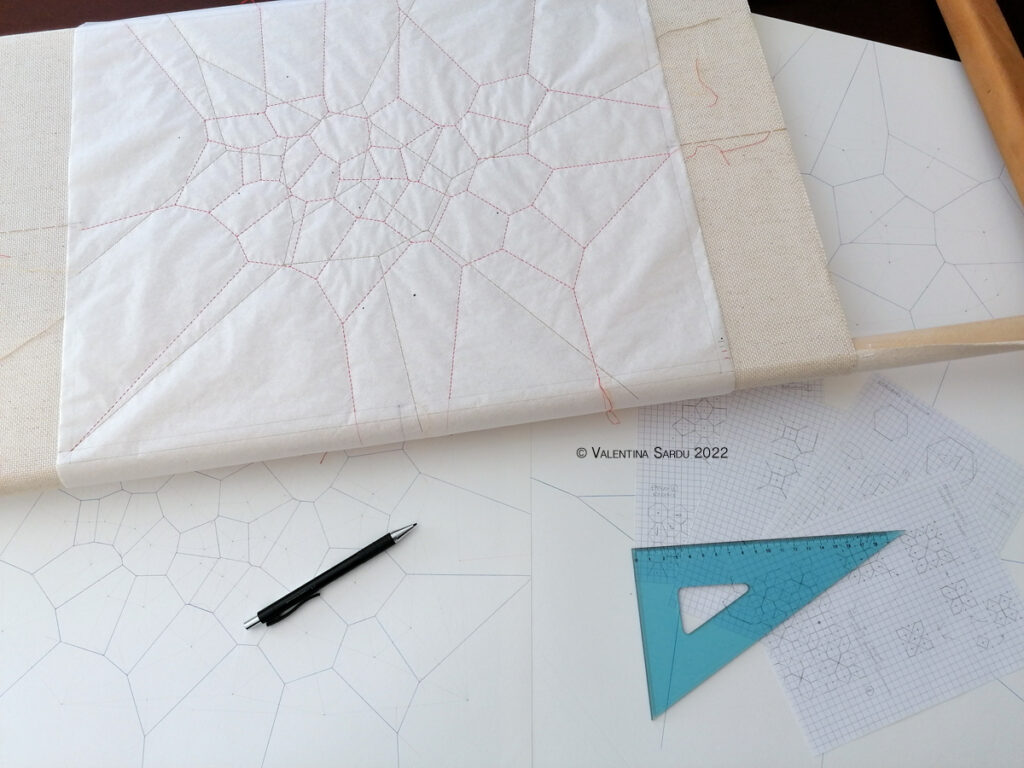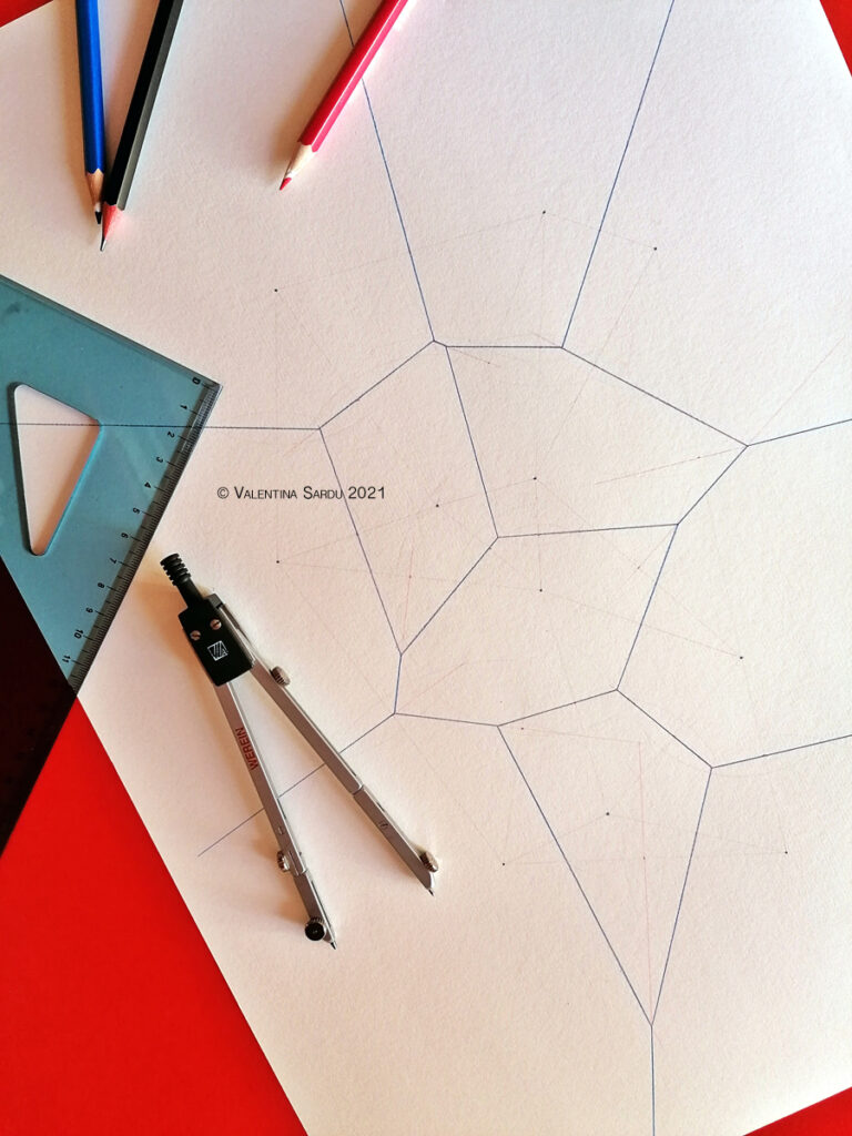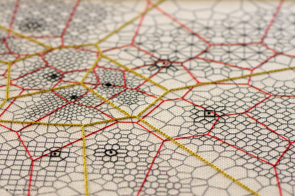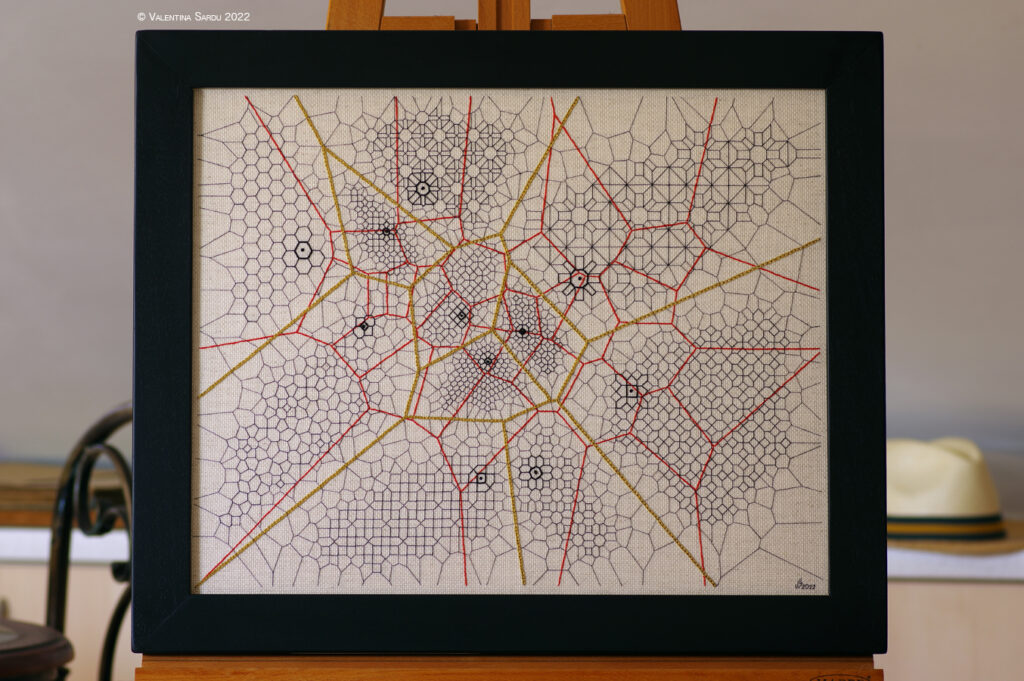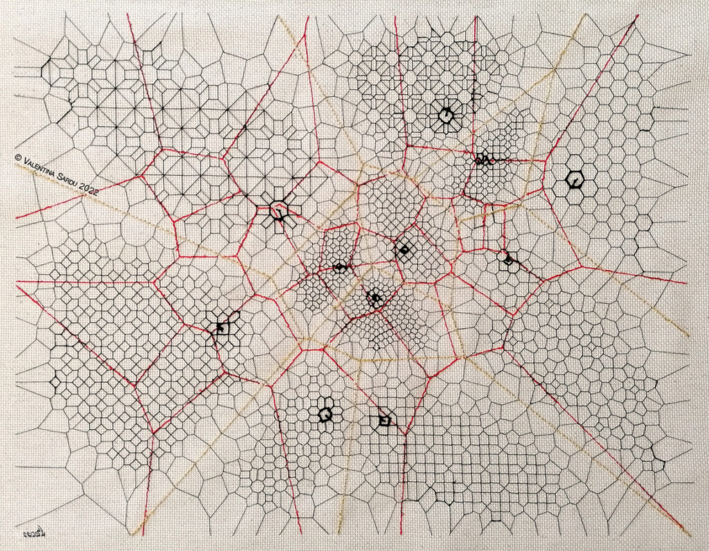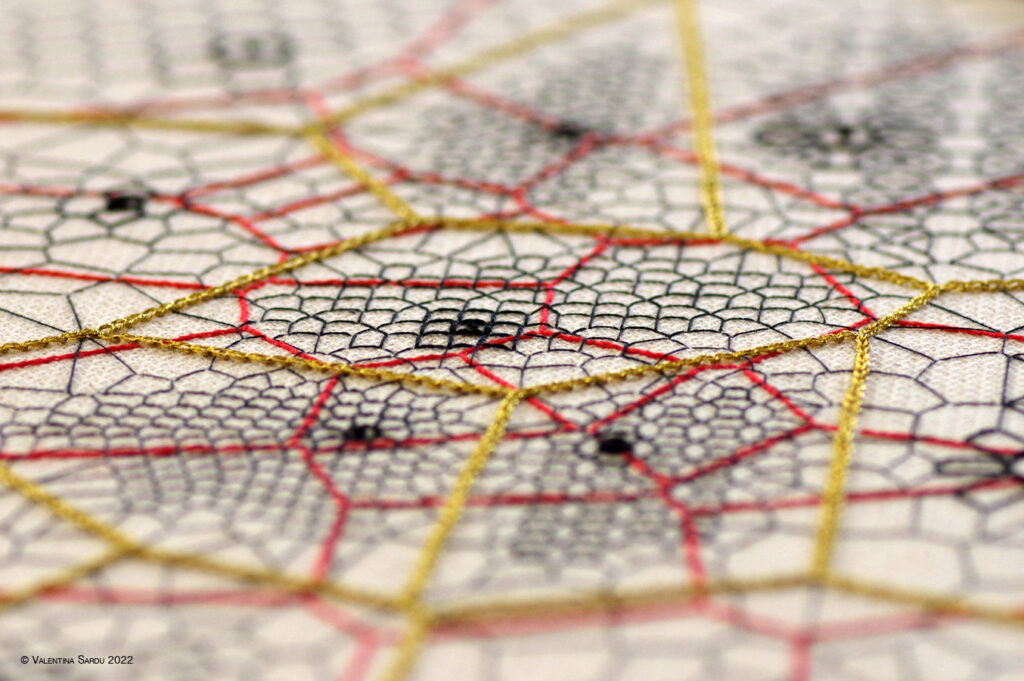 Per rappresentarla ho disegnato con matita, squadrette e compasso, alla vecchia maniera, varie tassellature di Voronoj partendo da punti casuali sul foglio. Esistono script per programmi professionali di design che generano in automatico delle strutture di questo tipo, ma desideravo che il processo di creazione mi appartenesse dall’inizio alla fine, e ho voluto quindi seguire ogni fase senza automatismi. È stata una di quelle volte in cui ho considerato l’atto del progettare, disegnare e ricamare, quasi più importante del risultato stesso, e ci sono stati giorni in cui mi ha aiutata ad andare avanti e a non sprofondare nella depressione.