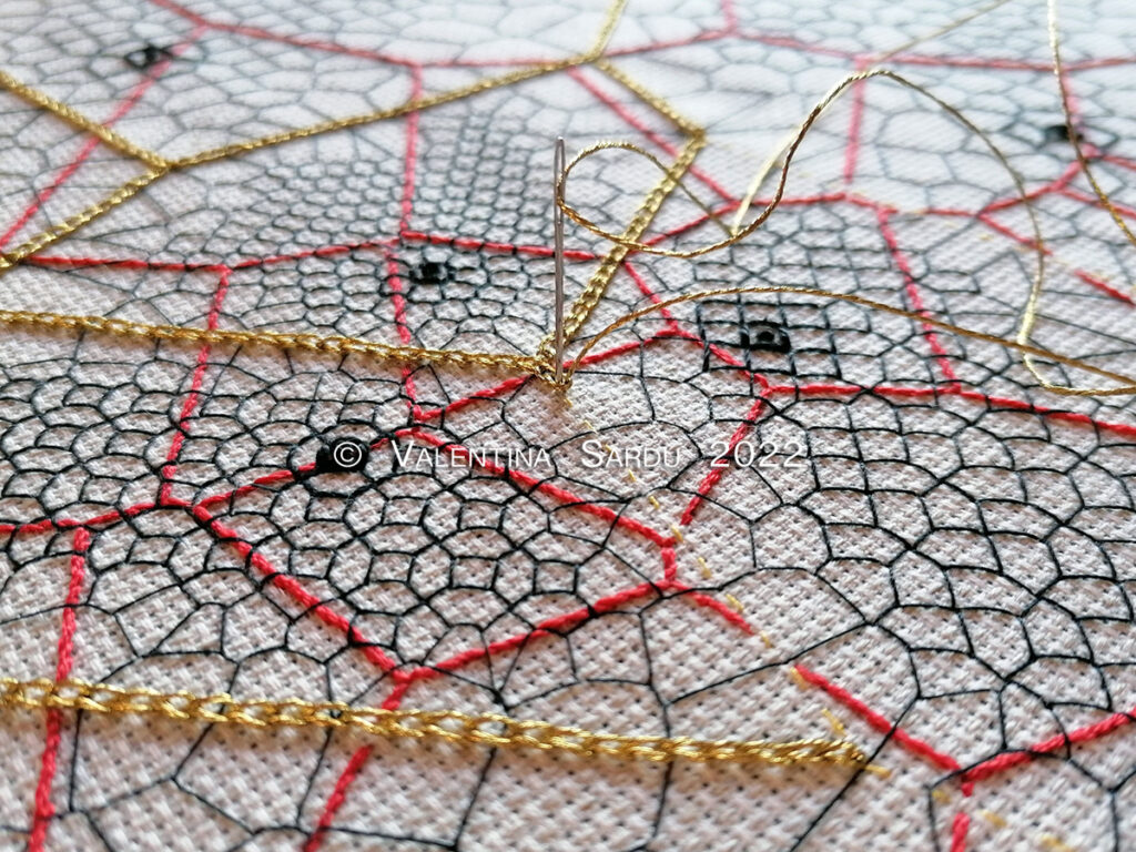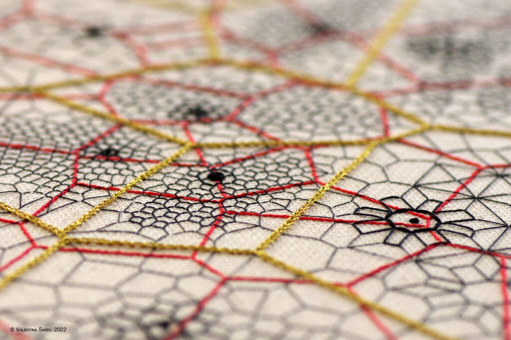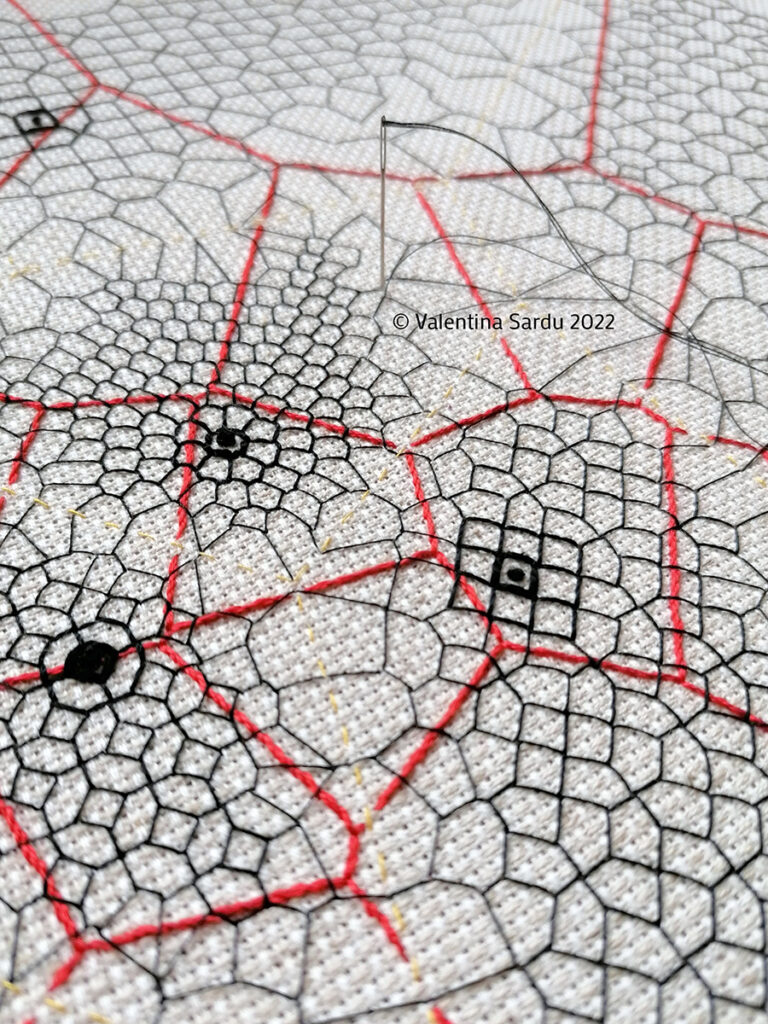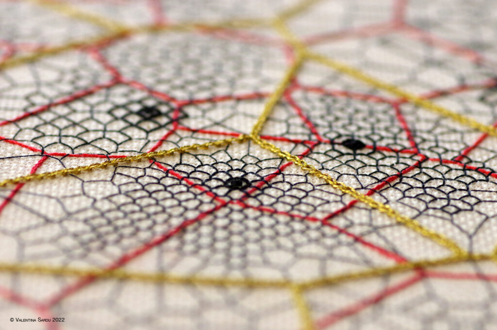 Ogni pattern di ogni regione interagisce con i pattern delle regioni adiacenti, creando di fatto un’unica struttura. Ogni linea in questo ricamo non è casuale ma calcolata. Ho ricamato non solo con ago e filo ma anche con righello e goniometro. Ho dovuto anche tener conto della naturale lieve irregolarità dei quadretti della tela, aggiustando qua e là i punti nelle zone periferiche per poter far quadrare il tutto con un minimo di tolleranza.