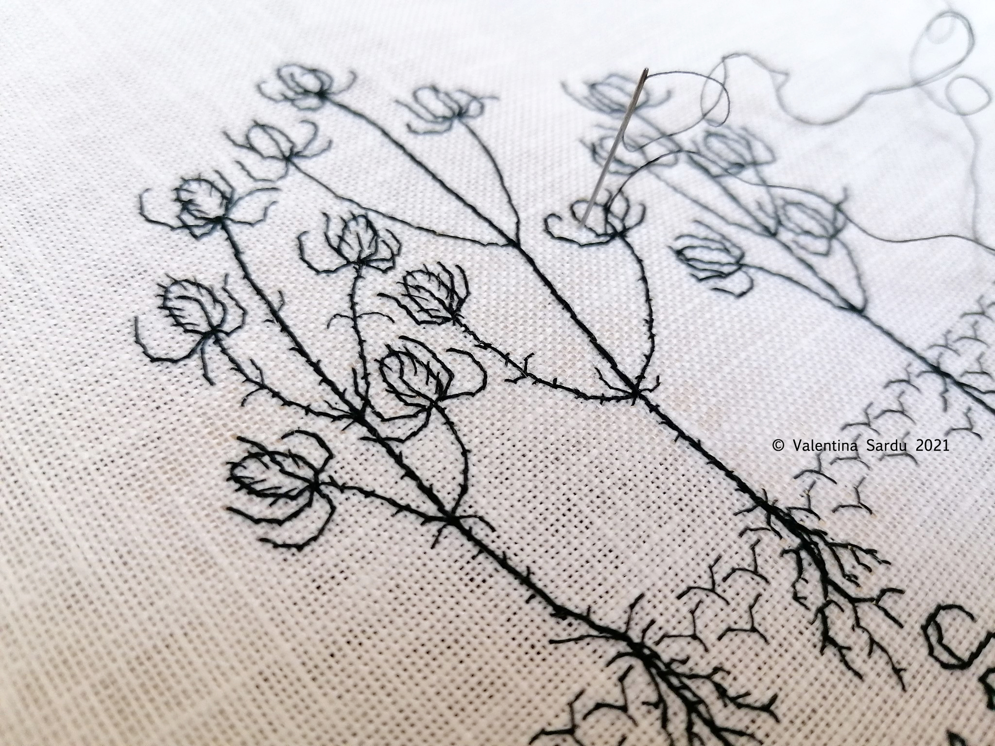 Fili usati: Retors d’Alsace DMC bordeaux grossezza 12; cotone da ricamo DMC n°25 in vari colori (azzurro, rosso, rosa salmone); cotone makò Aurifil nero in tre grossezze diverse (12, 28, 50); mouliné DMC in quattro gradazioni di rosso; filo da cucito grigio Sylko Bold; fili metallizzati di varia composizione e spessore (Gütermann, Aurifil Brillo, Dmc Diamant).