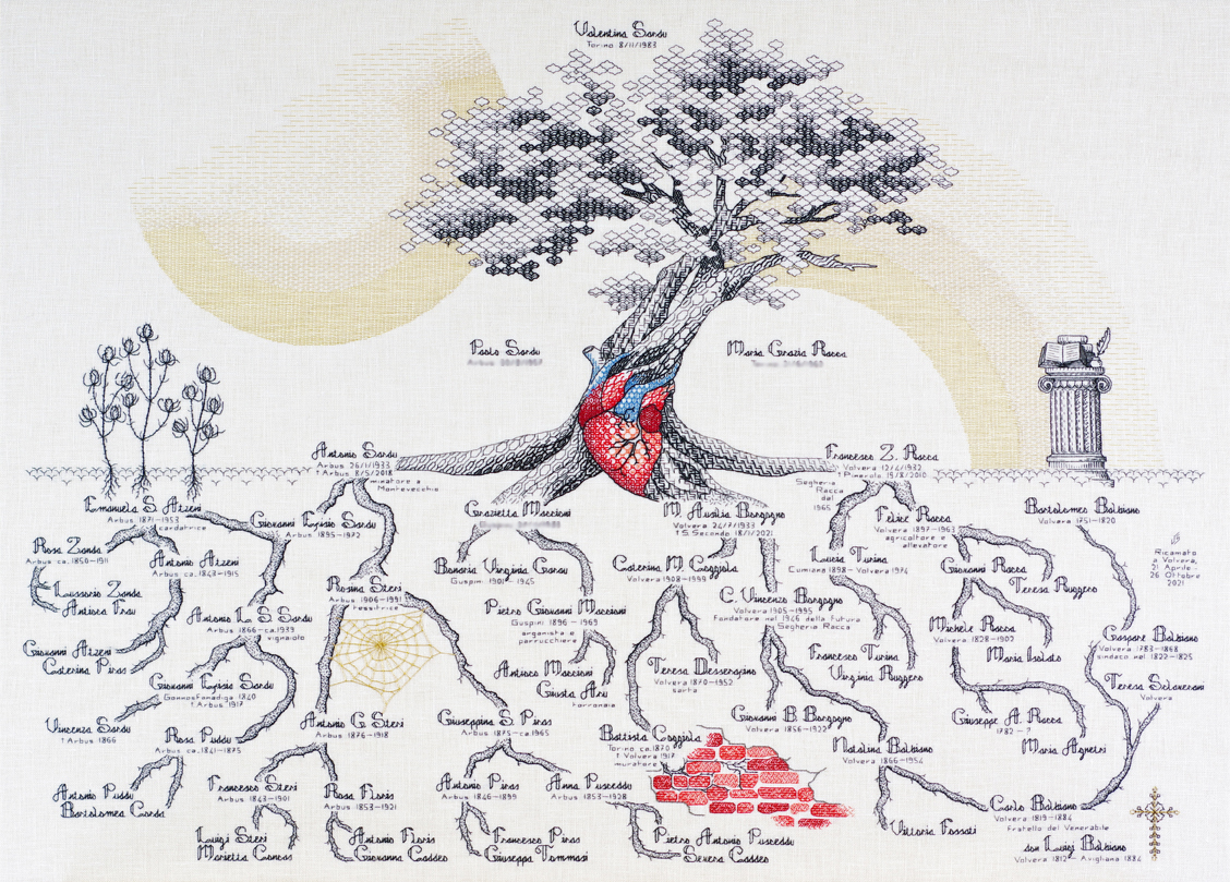 Un ringraziamento speciale a tutti i parenti che mi hanno aiutata in questa ricerca, in particolare ai miei genitori, a nonna Grazietta, alle mie prozie Rita e Marcella, ad Albina Racca, Giovanni Borgogno, Liliana e Piero Coggiola, e tutti gli zii e cugini che mi hanno dato informazioni preziose. Il ricamo è solo una parte di tutta la ricerca… Per ragioni di spazio ho potuto inserire solo le mie ascendenze dirette: genitori e nonni dal primo al quinto grado (sesto grado per un ramo), escludendo le linee collaterali. Ho messo comunque su carta ciò che nel ricamo manca, e ci sarebbe ancora tanto da scoprire.